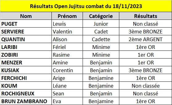 Résultats de l'Open de Jujitsu combat du 18-11-2023 à Lyon :